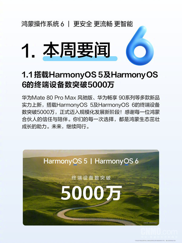 【CNMO科技音讯】3月27日,华为结尾云就业官方发布“鸿蒙生态一周更新速览”。据CNMO了解开云体育,搭载HarmonyOS 5及HarmonyOS 6的结尾建立数于本周冲破5000万。