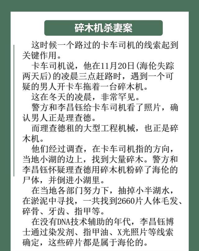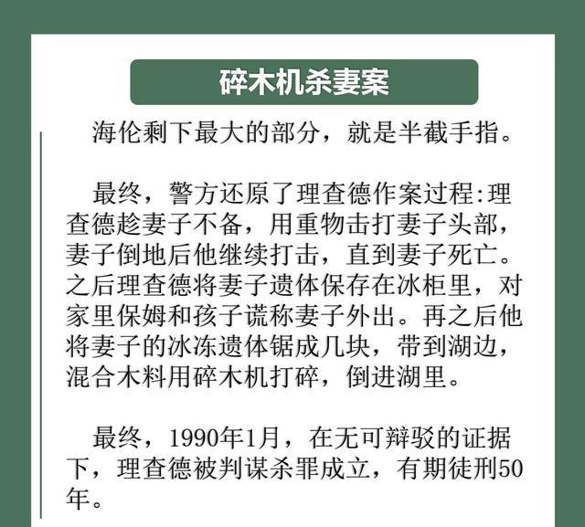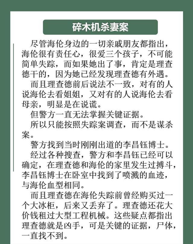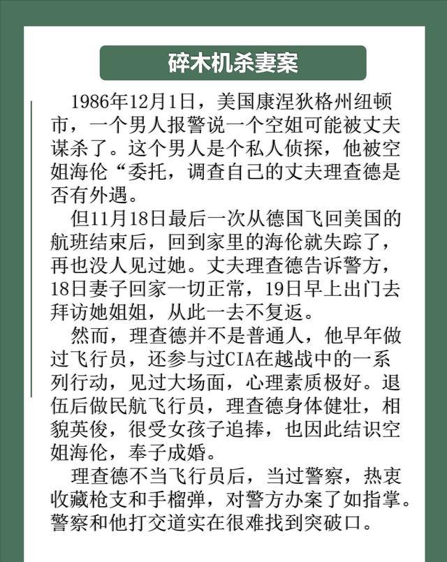 最经典的一案便是碎木机杀妻案;简而言之便是空姐海伦怀疑老公有外遇,找私家窥伺探访,效劳请托正在进行时短暂失散了,于是报警乞助。